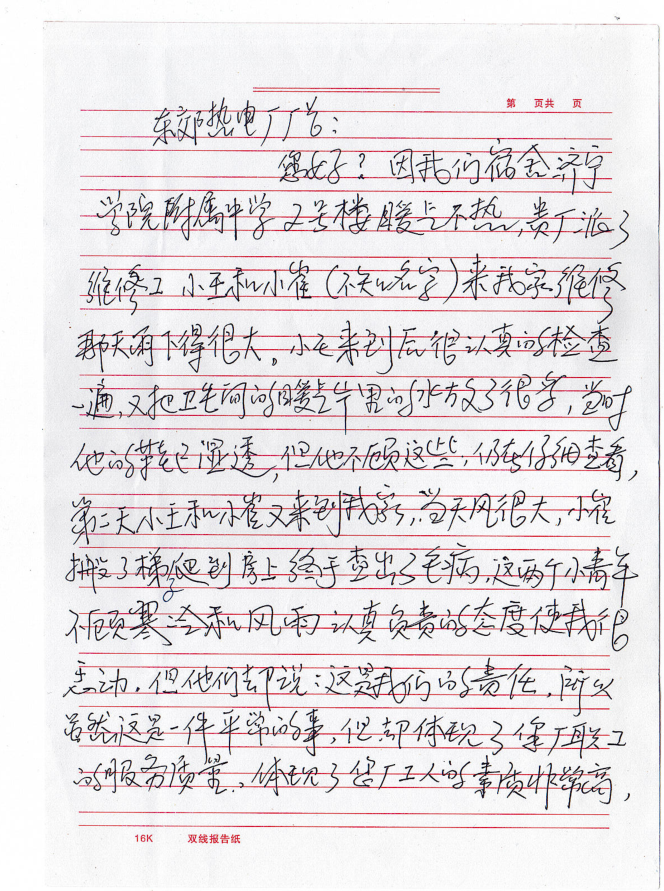 近日,山東聚源熱力公司收到一封來自濟寧學院附屬中學宿舍張老師寫的表揚信,信中這樣寫道:“東郊熱電廠廠長(現(xiàn)為山東聚源熱力)您好,因我們宿舍濟寧學院附屬中學2號樓暖氣不熱,貴廠派了維修工小王和小崔(不知名字)來我家維修。那天雨下得很大,小王來到后很認真的檢查一遍,又把衛(wèi)生間的暖氣片里的水放了很多,當時他的鞋已濕透,但他不顧這些,仍在仔細查看。第二天小王和小崔又來到我家,當天風很大,小崔搬了梯子爬到房上終于查處了毛病,這兩個小青年不顧寒冷和風雨認真負責的態(tài)度,使我很感動,但他們卻說這是我們的責任。雖然這是一件平常的事,但卻體現(xiàn)了您廠職工的服務質(zhì)量,體現(xiàn)了您廠工人的素質(zhì)非常高,也體現(xiàn)了您廠的廠風正,培養(yǎng)了這么好的職工,請領導對他們進行表揚,號召全體職工向他們學習。弘揚正氣,使我們的社會更加和諧。”